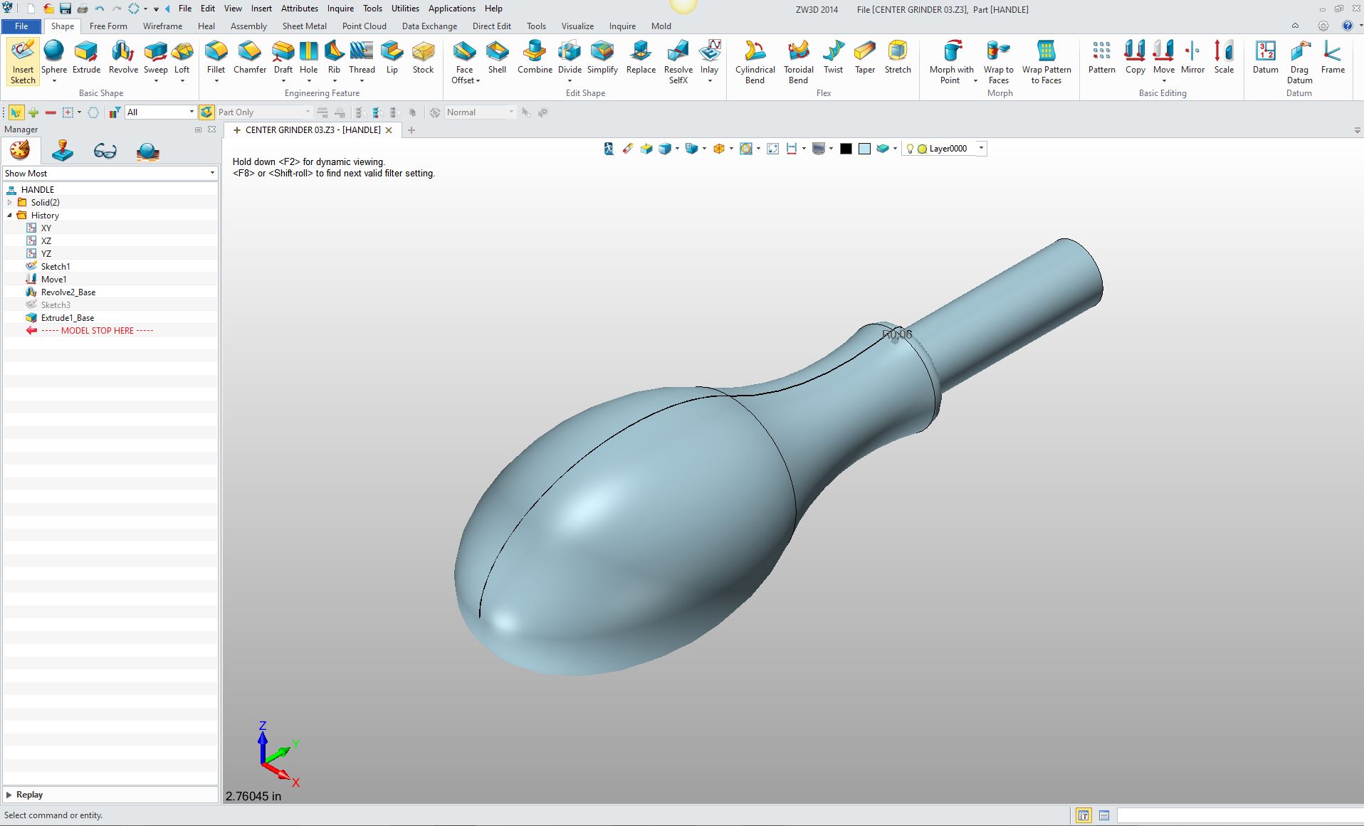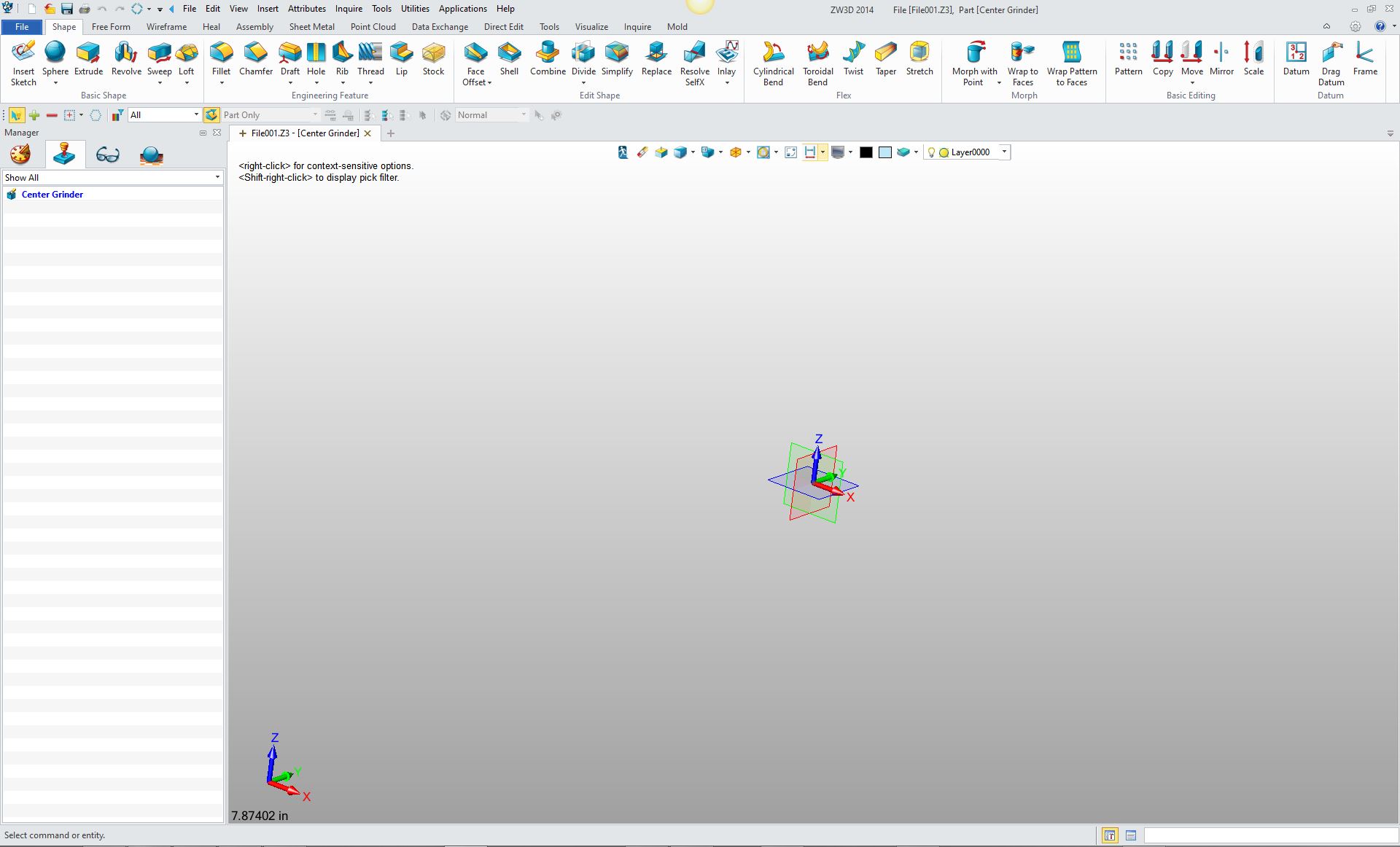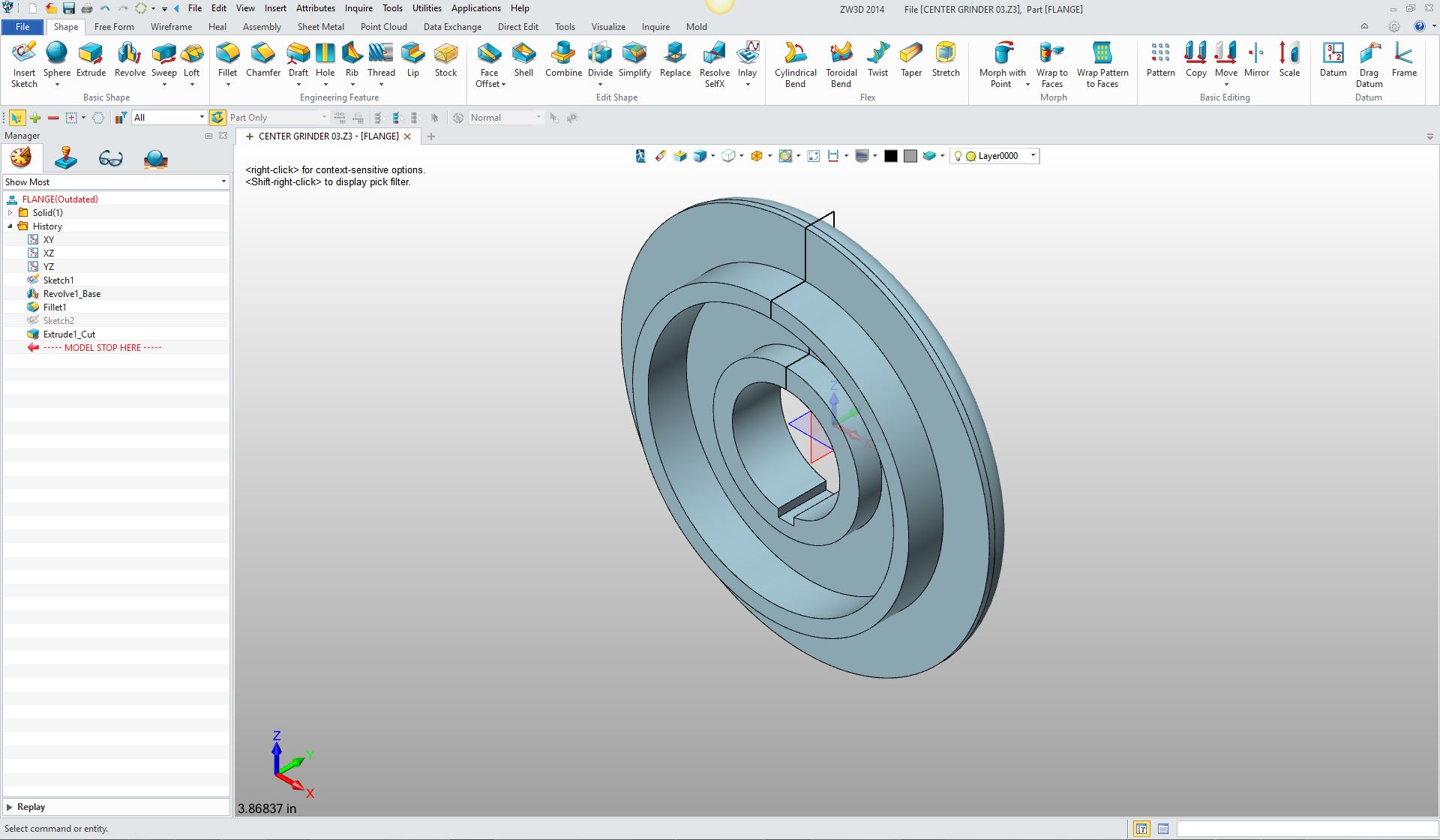 Educating the New 3D CAD Engineer - 2015 Basically all mechanical solid modeling 3D CAD systems are the same. Some are history based only, some with both history and direct edit and some are direct edit only. But they all have extrude, spin or revolve, loft and sweep as their basic construction tools. I have had the above drawing on one of my other articles and I decided to use it to sharpen my skills with ZW3D. I have found that creating solids from a drawing is the very best way to gain experience in 3D CAD. They not only offer many modeling challenges but they also let you see how parts are designed. The above assembly is a great place to start. Feel free to copy and print it. All You Wanted to Know About Drawing to 3D Conversions All 3D CAD systems today are mostly generic so lets take a look as we start this project in ZW3D. ZW3D is unique that you can do the part, assembly and drawings in one file. You can even do scratch 2D drawings like Autocad or Draftsight. Here is our completed assembly We have opened up a Multi-Object file. ZW3D allows you to do the complete project: Parts, assemblies and drawings in one file. ZW3D offers easy to use top down or in context design. Here is our blank assembly. On the left is the top assembly "Center grinder" defined. In the center is our design construction planes. One by one we start adding our parts. The Plane: The first thing you need to completely understand is planes. They are an intricate part of the sketch based programs. They set up what function you are going to use to create your model. Extrude, spin, sweep or loft are all based on the sketch. Once you master planes, you are on your way to learning CAD. I have done some lessons on how to do this assembly in ZW3D. This is the first lesson. 3D Modeling Techniques ZW3D Lesson One Download a fully functional ZW3D for a 30 day free trial and give it a try EXTRUDE I would say that 80% of solid modeling is done with the extrude command. If you are creating parts from sample drawings you should start with the parts that are only made up of extrusions until you feel comfortable with the system. You can look on-line for drawings. Start with easy to complex. If you need some sample drawings, you find a wide variety of part and assembly drawings that shows ZW3D and IronCAD comparisons with all of the major and not so major product that turned in to a study in 3D modeling Techniques. 3D Modeling Techniques Defined We will start with the bearing, it is completely made up of extrusions. Below is a wireframe view showing the sketches that make up the part. It is very important to create the features in a certain order putting the holes in last. Here is a view of the finished rendered part. Blends should be added last. REVOLVE OR SPIN Let's move to the next most commonly used function: the Revolve or Spin. This is the next most popular design tool in all CAD packages and is probably used 15% of the time. There are two parts in this assembly that use this command. Here is the handle. You can see the sketch features. It is not so straight forward. These folks love to use ellipses. I was guessing a bit here. The cylinder on the end was done with an extrusion. The flange is also created with the revolve tool. You can see the sketch from which it was created. I added the blend on the side later. I rarely include a blend in the sketch. They are much easier to edit if put in later. PRIMITIVE SHAPES Many of the systems only have sketching and no primitive shapes. ZW3D offers 5 basic primitive shapes: The Sphere, the Block, the Cylinder, the Cone and the Ellipsoid. You can use these through out the design process. This coupling ring was interesting. I pulled a sphere from the primitive shapes and just cut the sides as shown in the sketch. I am not really used to designing in sketches. I mostly use IronCAD with Drag and Drop Shapes from Standard or Custom Catalogs. I am sure there may be better ways to design in the Pro/e sketch, sketch, constrain, constrain paradigm. I will get better as I get into more design with ZW3D. Now in the bearing and coupling ring you can see that we also used the hole tool. All CAD packages come with custom and standard hole tools. They are very easy to use. SURFACING There is another Design Paradigm besides solid modeling. Below we ran into a situation that required Surfacing. Surfacing may or may not be included in your 3D CAD system. So this part may not be able to be made with your system. But feel free to download ZW3D. Below is the pivot arm. It is made up of two cylinders attach by a twisted ellipse. I was hoping to do this in ZW3D Lite, but the twisted ellipse forced me to use ZW3D Standard to put the arm in as a ruled surface. ZW3D Standard has full free form Class-A Surfacing. Now I assumed this was the intent of the designer. I showed this to a pattern maker from the days before 3D CAD and he said no problem. On the left you see the steps that make up this part. You can see I have stopped the program at the two extruded cylinders with the elliptical holes. Here is the ruled surface utilizing the edges of the ellipses. I added the blends after combining the surface with the cylinders. ZW3D automatically made it a solid. But I was left with these holes. The ruled surface was tied to the edges of these holes so I couldn't delete them, I could have limited the depth, but ZW3D has direct edit and the simplify function actually allowed me to remove the holes in both cylinders. Here are the holes removed and the simplify modification step is in the history. This shows how you can use direct edit functionality as part of your design process. Much of this design was creating planes in different locations to create our parts or even creating them at the assembly origin and moving them into place. I am not really up to speed on the best practices of the Pro/e design paradigm and probably could use some tips. In IronCAD, the plane is not an independent feature so this is a bit new to
