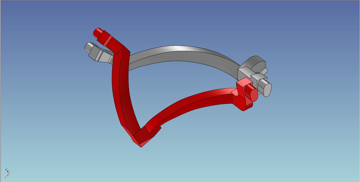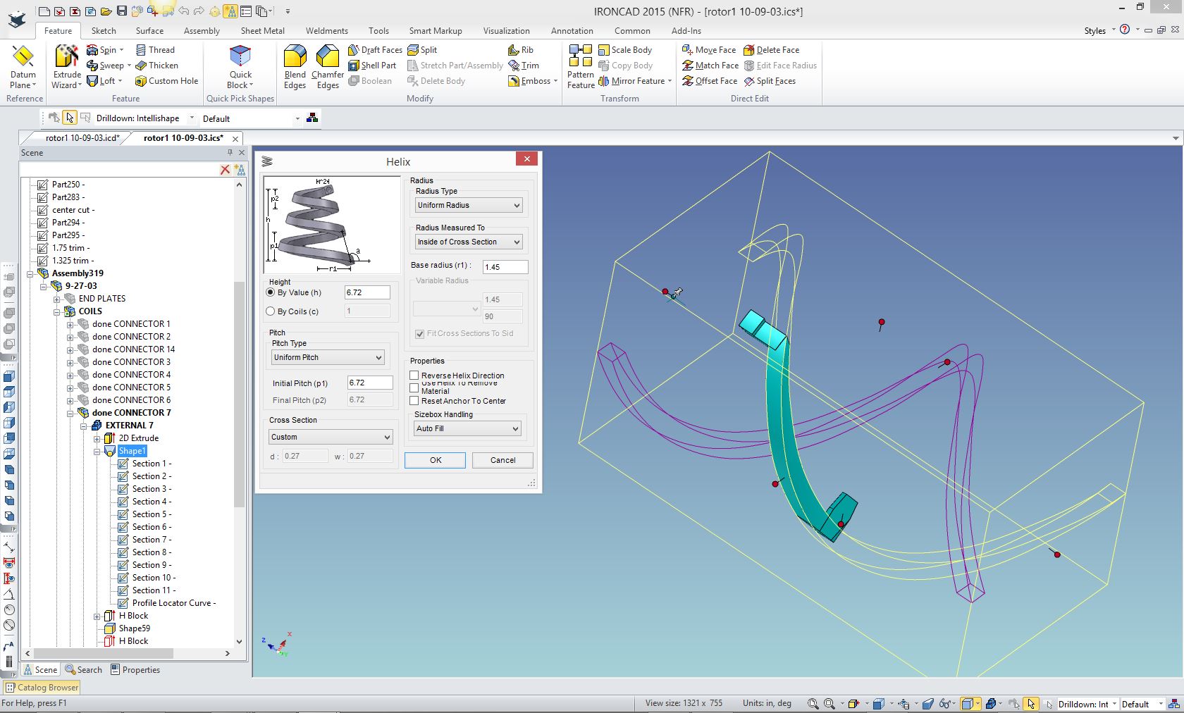 Even though this project was done over 13 years ago I thought I would pull it up and create a few more images. The image below shows is the basic helical shape of connector 7 in the history. The purple is a reference to the rotated linked image indicating that will also be affected by any changes. It was my first project with extensive use of the helix function in IronCAD. It was incredibly easy and fun.