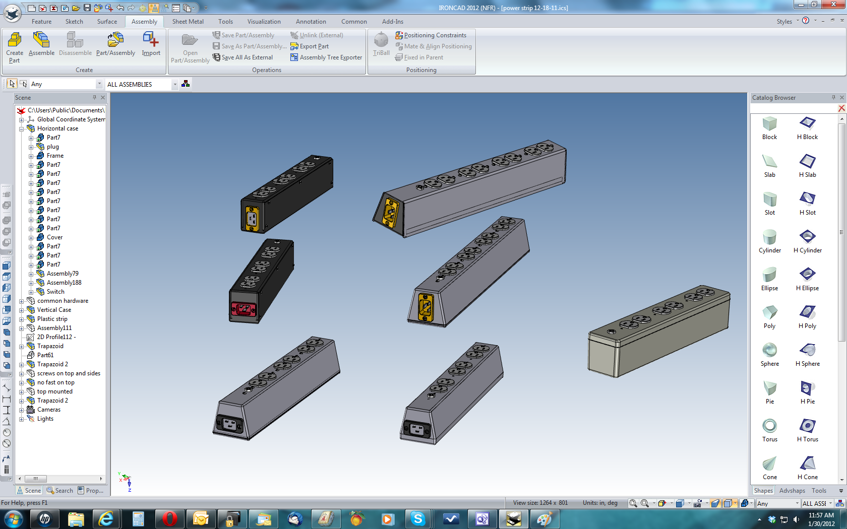 Above you can see the different designs for plastic and sheet metal power strips. As we work with the customer the design develops. As you can see they are all in one file. Not only can we work with similar parts we can works totally dissimilar part or assemblies. On the right is a catalog of shapes, advanced shapes, colors, textures, tools (such as custom holes, fasteners, gears, bearings, etc,), sheet metal or custom catalogs with features, parts or assemblies. This view is in an exploded configuration, not affecting the original location of the parts.