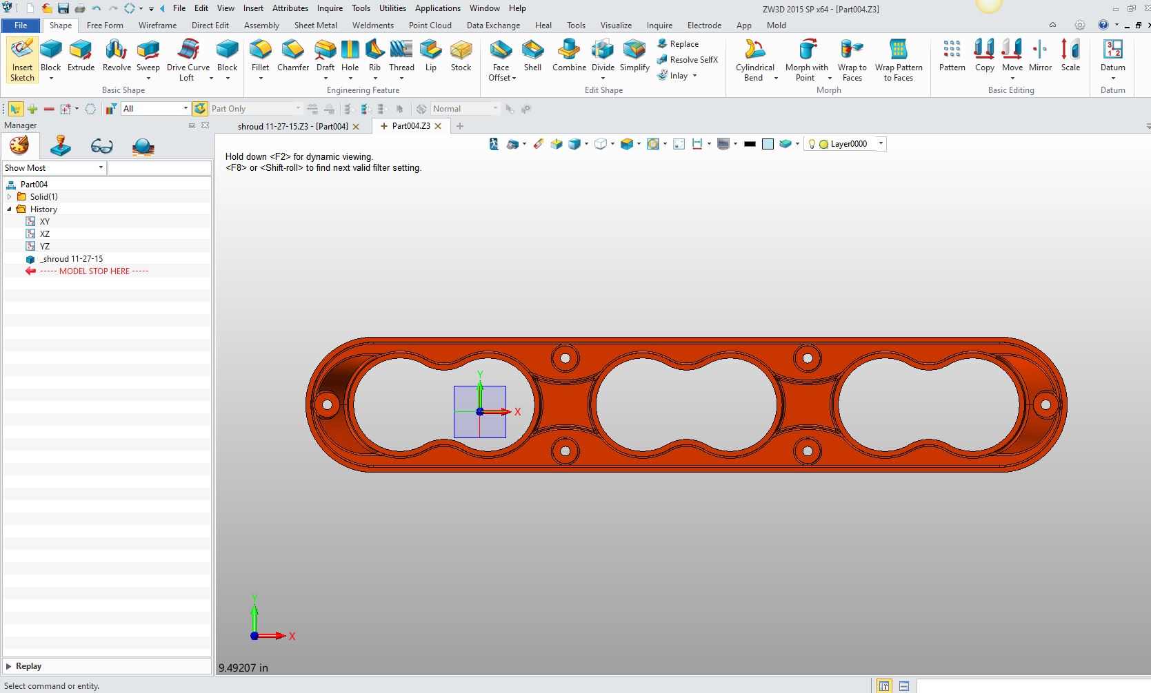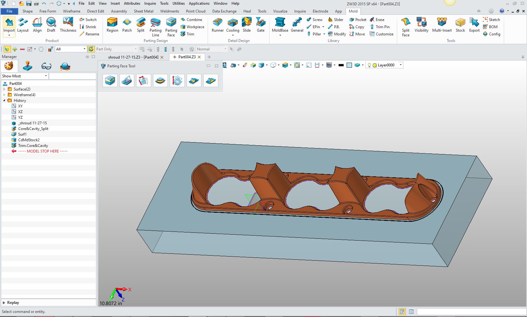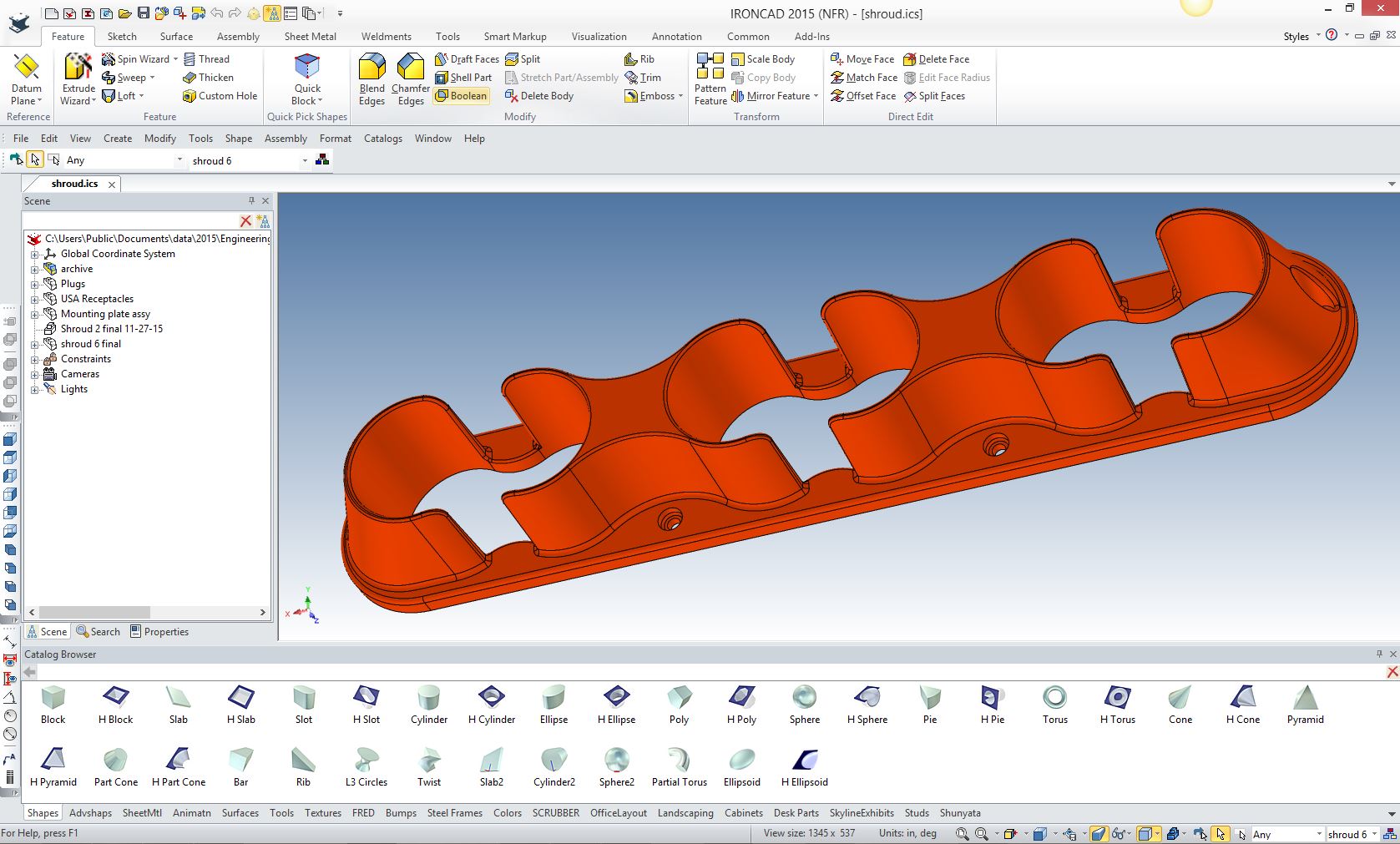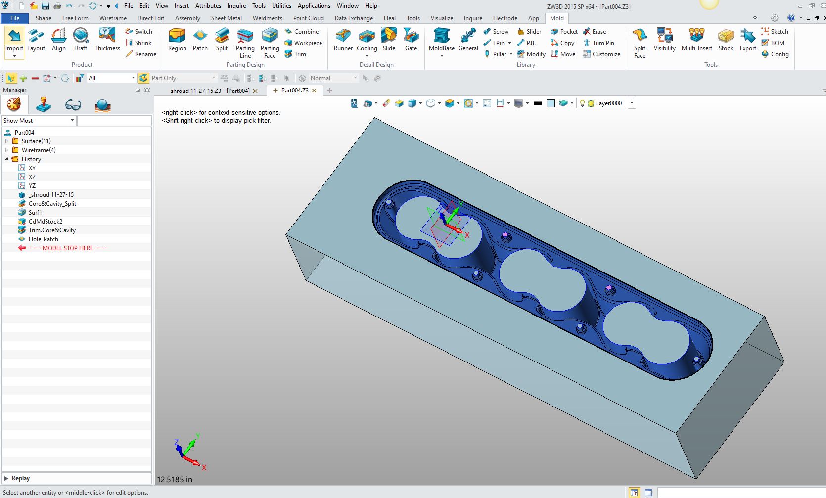 plastic product I designed was the Prototek LineFinder in 1998.It was an interesting experience and a great story. It was designed in IronCAD and it describes the first of the 3D .stl printing to create silicon molds. Then was modified for injection molding providing 3D IGES files to produce the molds with Pro/e CNC. The Prototek LineFinder I started doing quite a bit plastic product design from that point on. I would struggle to create the core/cavity split to make sure the parts had the correct draft and the parts could be made. Early on, CADKEY could create silhouette curves to define the parting line, then you would explode the solid model and separate the faces pass through's were a pain. Later CADKEY had a core/cav split function that would separate the faces. I was a bit funky and still took a lot of work. We took on ZW3D and it had an integrate mold design package. I really never got into the mold design side until I was contacted by one of my ZW3D mold maker customers that was struggling with a complex part trying to create the core/cavity split. He actually had ZW3D mold but was only using the CNC portion of ZW3D since he had a copy of Cadkey he was familiar with. Cadkey just couldn't do the job. I can't show it here but it was a doozy!!! We were really having a hard time and I said let's send it to ZW3D support. The next day we had the core/cavity split. We reviewed the process and saw some errors in the design that CADKEY overlooked. It was designed in Solidworks and the designer made some amateur plastic product design mistakes. Even though they were small mistakes, they stood out like a sore thumb after running it through the core/cavity split process. We just made a few changes that would not alter the function or aesthetics of the part, but made the core/cavity split much easier to create. I studied the process and saw it was very simple. So I started checking my parts. ZW3D mold would quickly show any problems with the part. Like faces that did not have draft. I got quite good at it. Not that it is a complex process. But it was fun to bring the parts in and assure they were complete and correct. Here is a picture of the shroud and a few other parts I designed. ![]() I will show you this simple process. Here is the original shroud that was done in IronCAD.