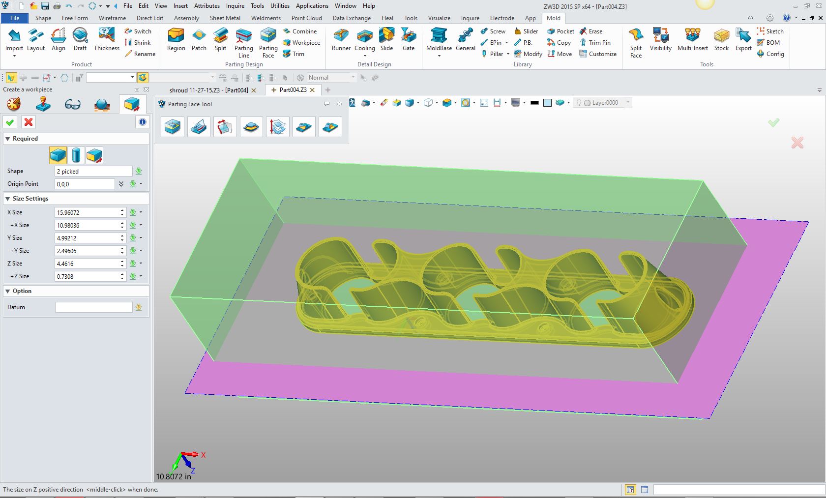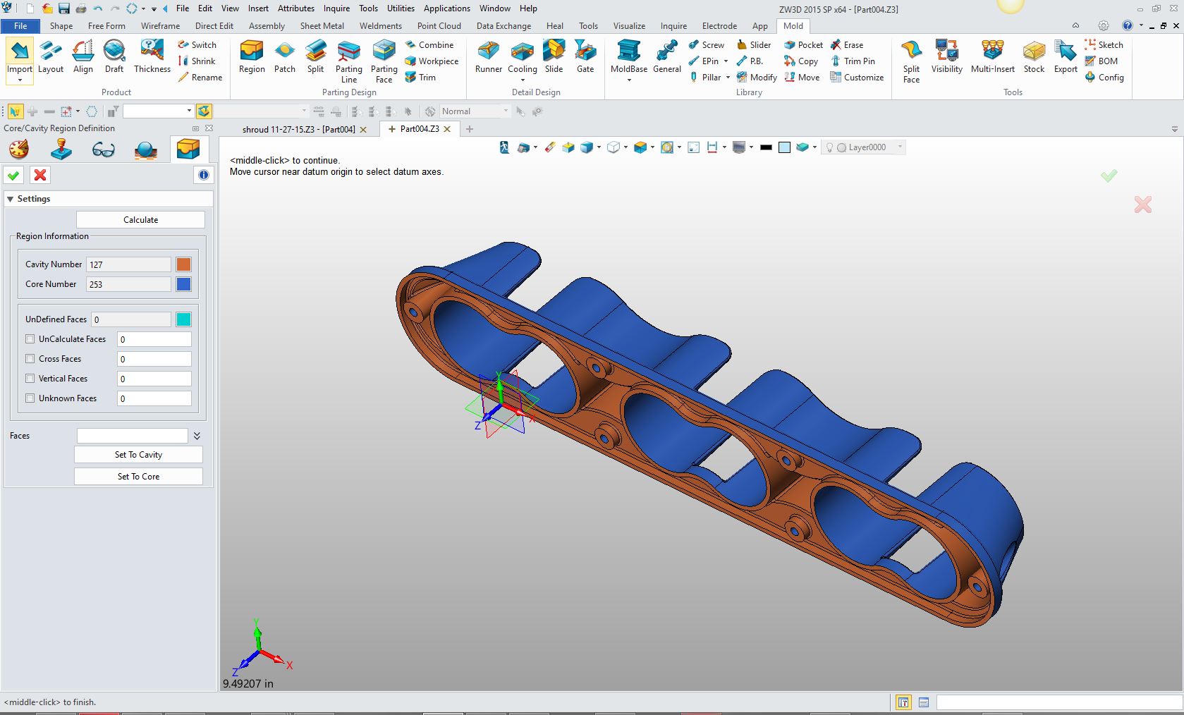 I export it as a parasolid .x_t file to ZW3D. Setting it up in the top View makes it a bit easier to process. If it didn't I would rotate it into the top view. Now we go to the mold design menu and select Core/Cavity region definition! You can see it has recognized 380 undefined faces. You can see that the core and the cavity faces are now defined and there are no errors. We now split the core/cavity. When you select go it comes up with this notice that the 2 regions have been defined. Now we create the parting face We then create the work piece and size it correctly. I am not too worried about the size just that it fits inside the parting face. If you were to continue to create the mold I am sure you would put a bit more time into it. Please realize this is a fully integrated mold design package. Watch the following video is shows some of the steps we had to go through working with the Solidworks model above then continues to full mold design. ZW3D Mold Design Now we are ready to trim the mold plate to core/cavity by parting faces. Job done in a few easy steps. I get a big kick out of seeing the resulting core and cavity created by my design. Here is the core and cavity So you can see it is as easy as one, two, three! Nothing like a good core/cavity split to realize when you are designing plastic parts you are actually designing holes in space! Give it a try. No matter what system you have you can bring your parts into ZW3D. No need to export in a neutral format, ZW3D reads the native files from all the popular programs including PMI For more information or to download ZW3D Besides integrated mold design, ZW3D Pro includes all of ZW3D Standard functionality such as History Based/Direct Edit Solid modeling, Easy Multi-Object Design (Top Down), integrated drawings, Free Form Class A surfacing, Robust Reverse Engineering including complete wireframe design and much more. ZW3D is a true integrated CAD/CAM system, you can go from Mold Design to CNC programing and machining.
