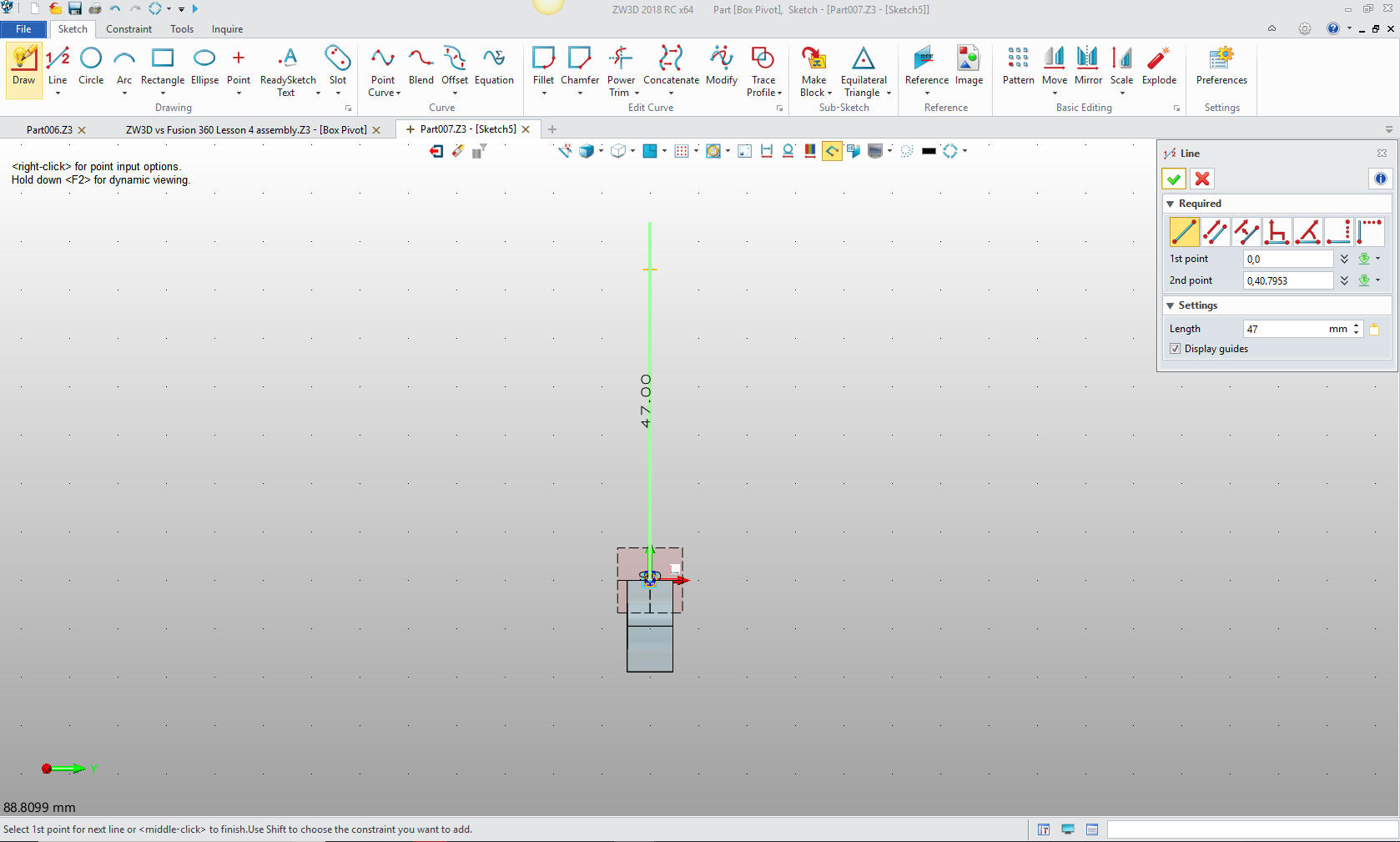 We delete the reference line and exit the sketch.