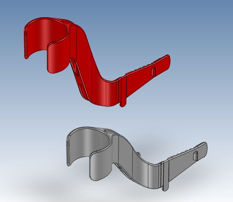 A customer came to me from a recommendation with a Solidworks project. He wanted to make this strap taller. I asked him why he didn't get the original designer to do the modification and he said he couldn't get to it in time. I then told him I didn't have Solidworks and would have to do it in a different program. He just asked "Can you get the job done fast?". I imported the native Solidworks file into IronCAD and started modifying the part. In doing the job, due to the extended length, I noticed that this draft was causing some problems. I soon realized that the Solidworks part had the draft originating from top plane of the part. For the original part this was a slight change and would probably not be noticed but with the increased height this would be unacceptable. I could not create the necessary draft from the diagonal face in IRONCAD and moved the part to ZW3D which had this capability in its surfacing package. See the difference below. The original part